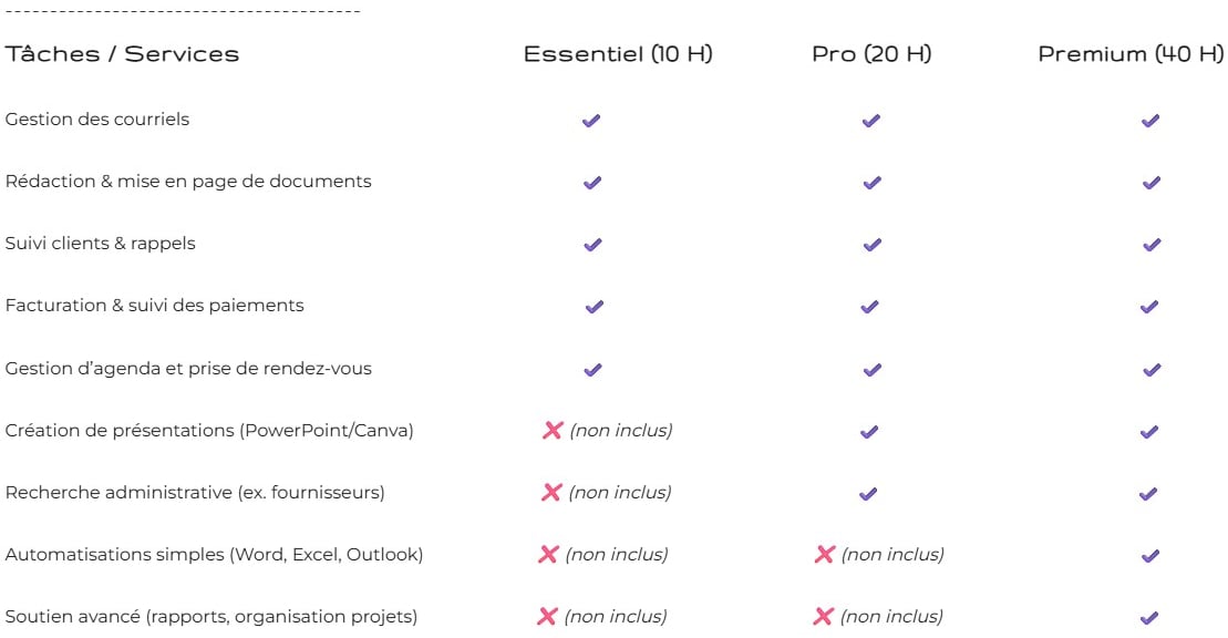 Tâches / Services Essentiel (10 h) Pro (20 h) Premium (40 h)